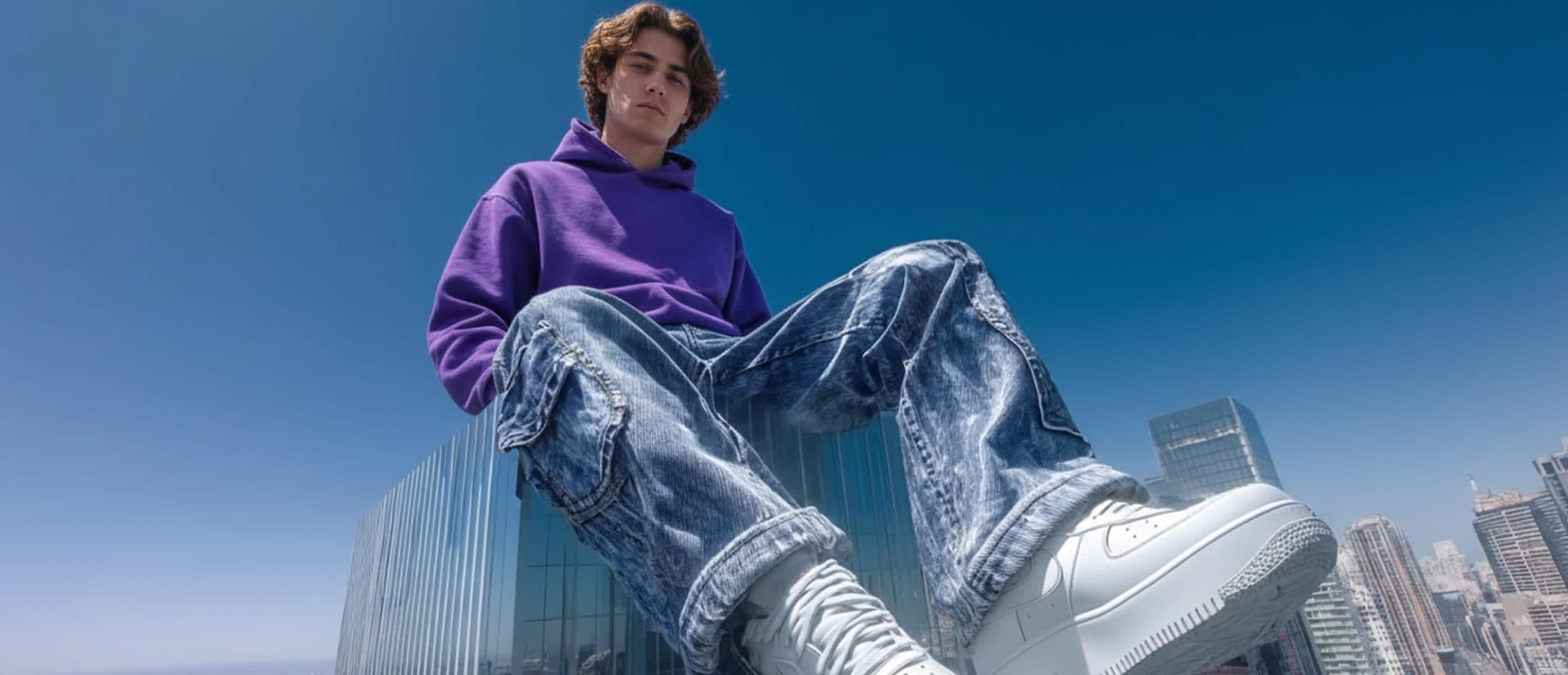 Starting from a realistic image of a person standing on the ground, the camera begins a smooth vertical zoom-out...